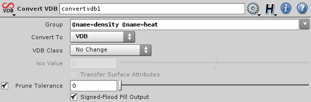 - The volume needs to be converted to VDB before writing. Tab-create a Convert VDB node and connect it below the import_pyrofields node. Select the convertvdb1 node to set the parameters for conversion. Use the arrow to the right of the Group box to select the grids to export. From the visualization node you will be able to choose from density, heat and temperature. They should be written in the format @name= fieldName. Change Convert To to VDB.