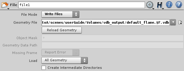 - Connect a file node to the convertvdb1 and change File Mode to Write Files and enter a file location to Geometry File. Add the variable $F to write out multiple frames.