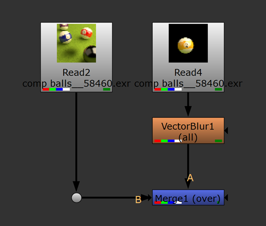 - Connect a 'Vector Blur' node to the pool ball render. We will use the Vector Blur node to blur the pool ball using the 'Motion Vector AOV'.
