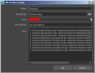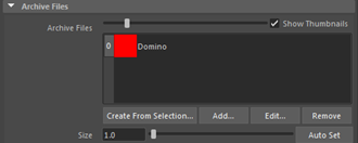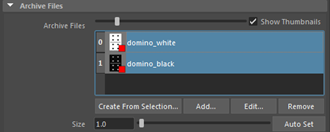 - Click on the Thumbnail folder icon and choose a bitmap that represents each domino. In the examples below, you can see that we have screen grabbed the Maya viewport for each domino and saved those images to files. We can also change the color of the icon and increase its size by adjusting the slider above: