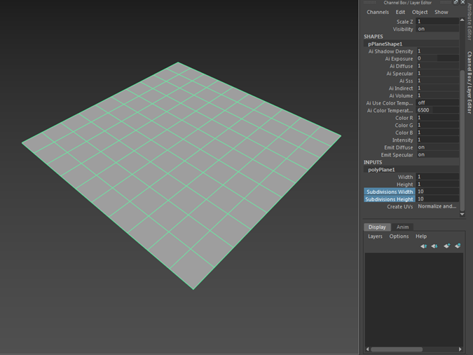 - We now need a surface to apply our XGen domino archive. Create a polygon plane and increase its Subdivisions Width and Subdivisions Height to 10. We will use this plane to assign the XGen description.