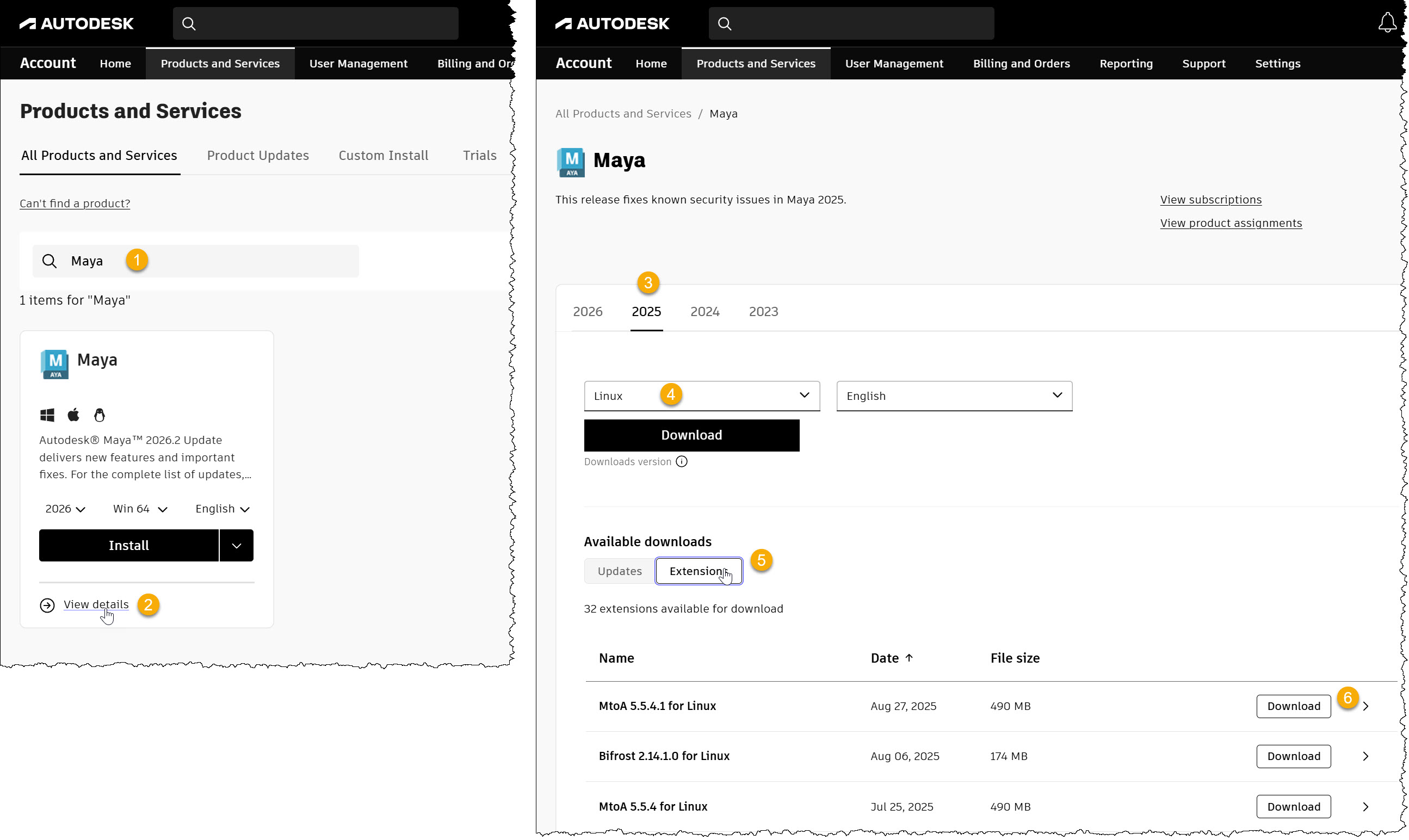 All Products and Services allows you to download MtoA for different versions of Maya. For example, for Maya 2025, you get a list of the available MtoA downloads.