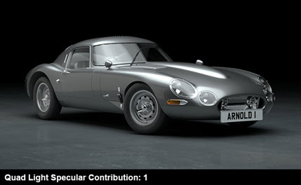 We are getting some blown highlights on the hood of the car. Reducing the exposure of the light would help with this. However, it would also reduce the overall illumination in the scene, which is not what we want. A simpler and more effective method is to reduce the specular contribution of the quad light.