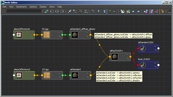 - Connect the boat's standard surface shader (with specular weight) to the remaining attributes (camera, specular reflection, transmission, and shadow).