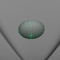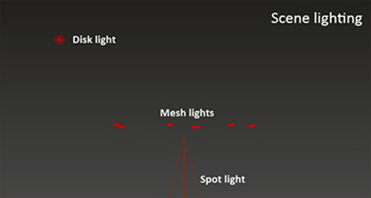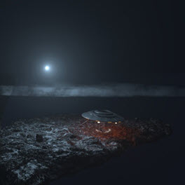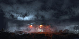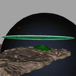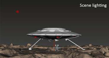 - A polygon sphere is positioned above the scene and below the Disk light. This will be used as the 'cloud layer'. It is positioned in between the disk light and the scenery. A duplicate sphere that represents ground fog has also been positioned near the ground underneath the UFO.