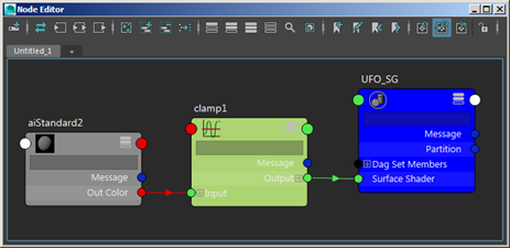 - Middle drag a Maya 'Clamp' node onto the 'Surface material' attribute of the Shading Group for the material that you want to clamp (in this case a standard surface shader).