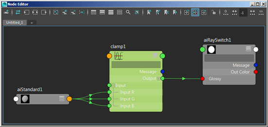 In the example below, the specular attribute of a standard surface shader has been connected to a Maya clamp node. The clamp node is then connected to the glossy attribute of the ray switch shader. It will work as a secondary ray clamp instead of the general clamp in Render Settings window. This way you get the benefit of keeping your range in the direct highlights, but you can also control any secondary ray noise.