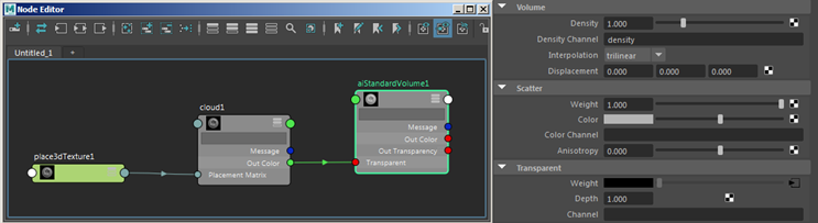 - A standard volume shader is assigned to the sphere (increase the step size of the sphere to 0.1 for it to render as a volume). A Maya 'Cloud' texture is connected to the transparent color.