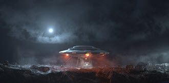 The scene is lit with an area light with its light shape set to disk (moonlight). The UFO's lights are geometry that have been converted to a mesh light. There is also a spot light pointing underneath the UFO and an area light on the right side. Atmosphere volume has been enabled in the MtoA Render Settings window.