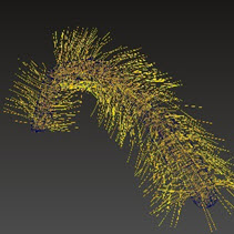 - Go to the Grooming tab and select the Bend brush. In the viewport move the mouse over the leg. You should see that the cursor has changed to the brush tool. Click and drag the brush along the leg from the top to the bottom. You should see that the hairs bend as you brush along them.