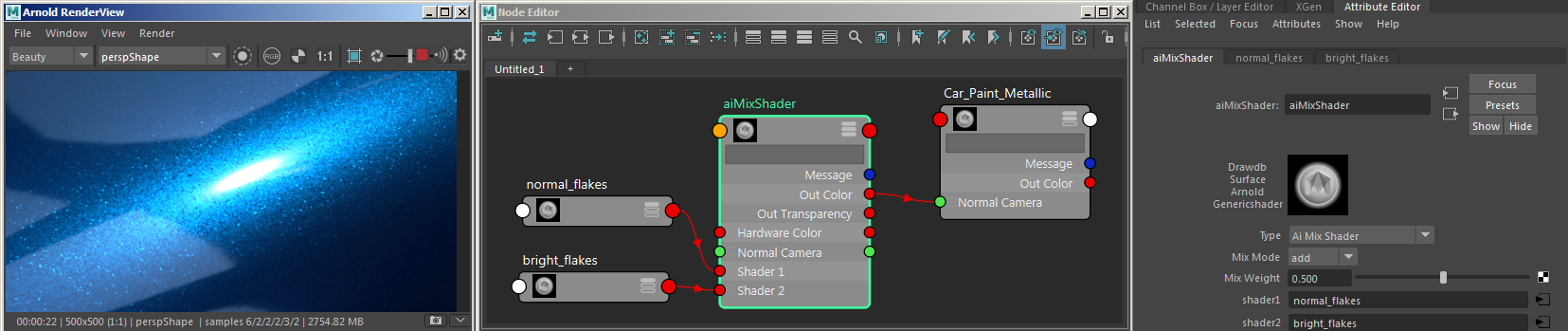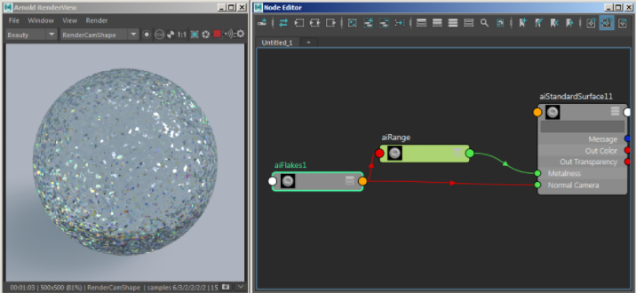 flakes -> normal_camera and metalness of _standard_surface _(via a range shader)