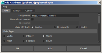 ) to select the shape node.Add the Long name - 'mtoa_constant_Texture' ('Texture' is the prefix that we will use for the User Data String, but you can call it what you want (do not use 'name', it will not work). Set the 'Data Type' to 'String'.