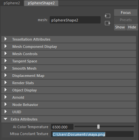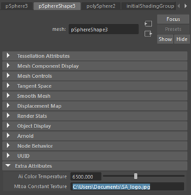 - Select the shape node for the sphere. Under 'Extra Attributes' you should find the newly created Attribute - 'mtoa_constant_Texture'. In the text field next to this, type the full path name of the texture (must be the absolute pathname).
