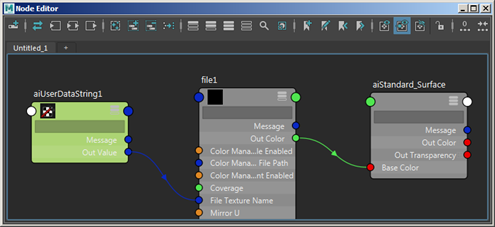 Assign a standard surface shader to the sphere. Connect a file texture to the base color attribute. Create an User Data String.
