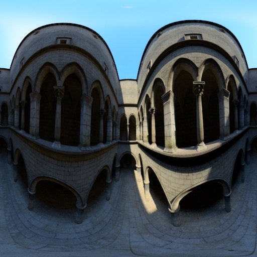 The image below is a render of the spherical camera in the center of the scene. The scene must be rendered at a high enough resolution and the pixel aspect ratio should be set to 1, otherwise, distortions may appear in the reflections of the scene.