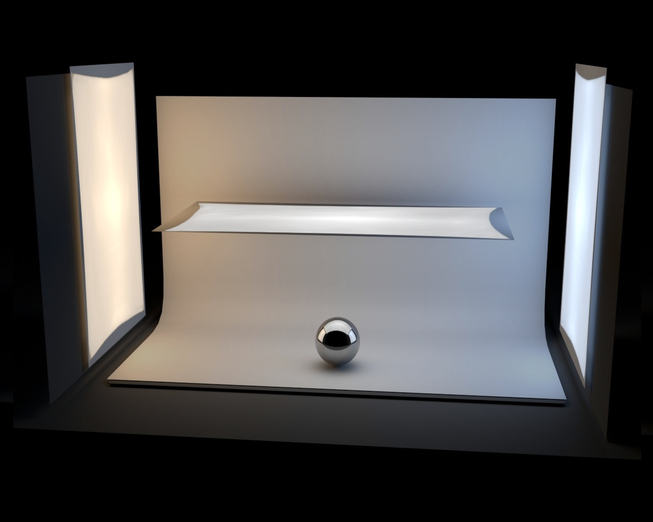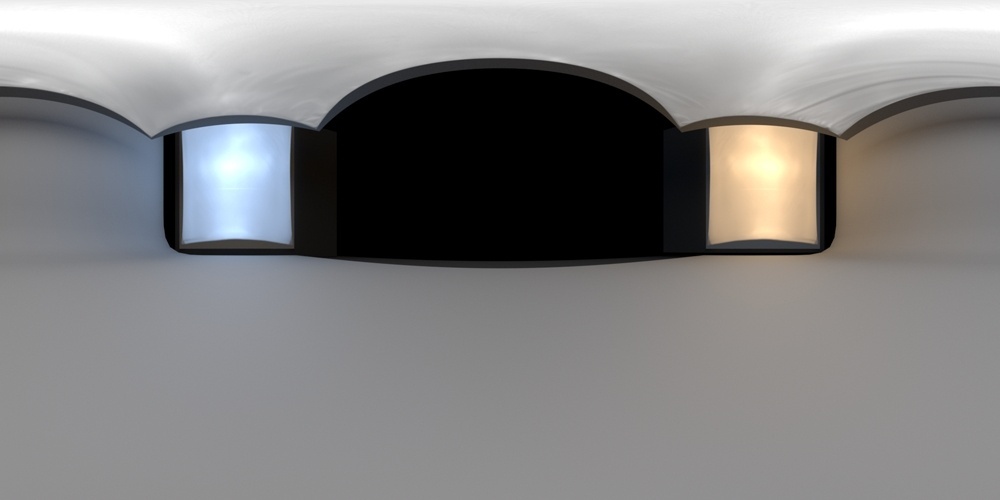 Below is an example of a spherical camera lens. The image below shows a studio lighting rig scene. The Spherical Camera can be used to convert this scene into a 'spherical' HDRI that can be used with the Skydome Light.