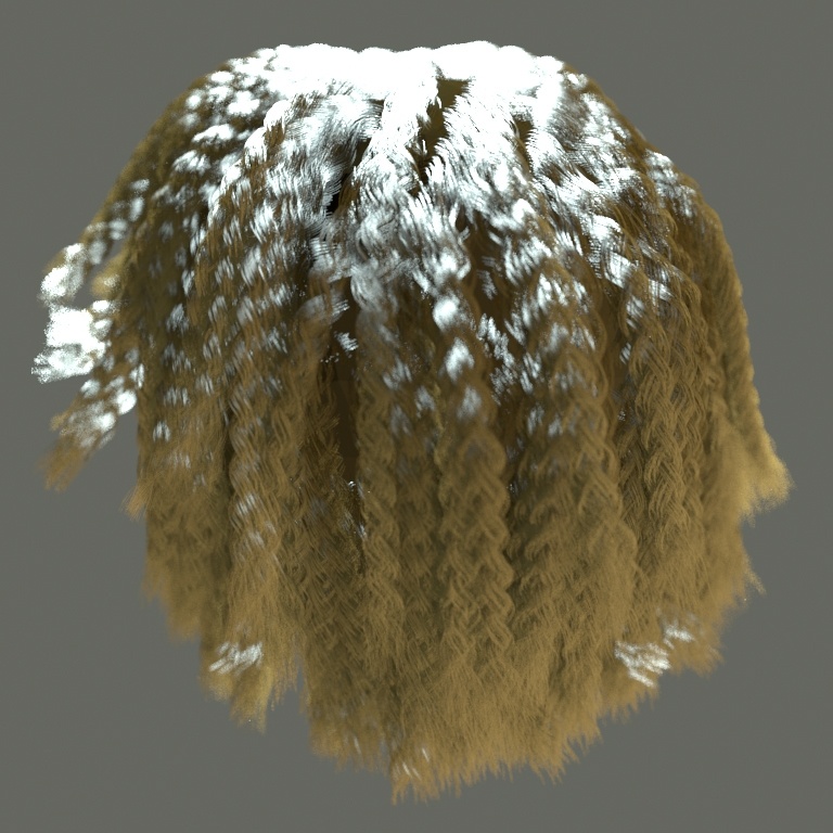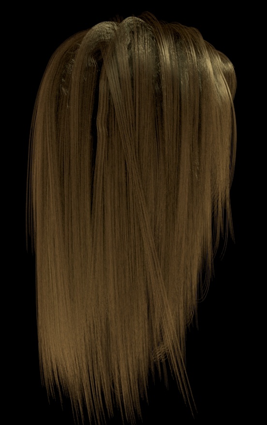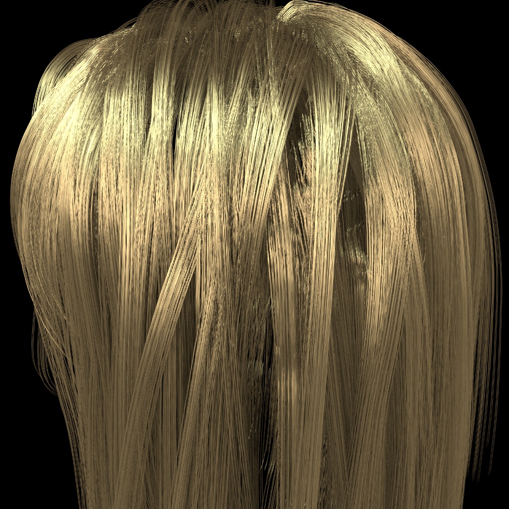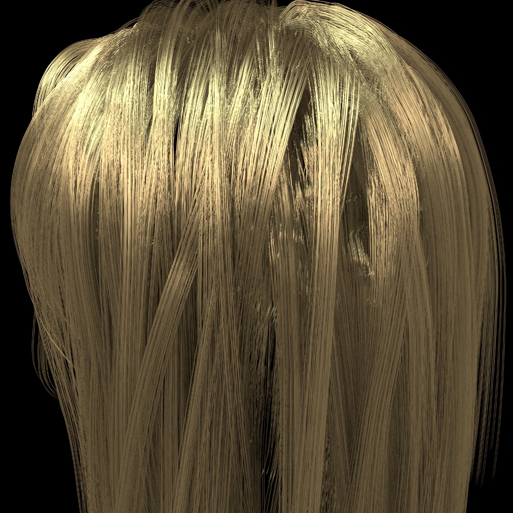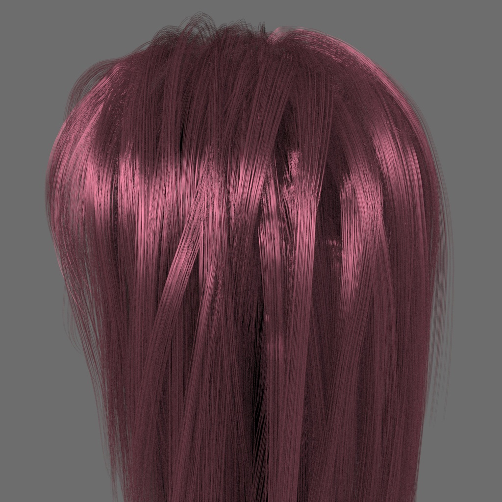The Hair shader has a secondary glossy specular lobe with its own Scale, Color, Glossiness and Shift controls. The secondary specular tends to shift towards the root of the hair, which is achieved with a positive value in the Shift control. Even though in real hair the secondary shift is linked to the primary shift with the expression secondary shift = primary shift \ -1.5*, the specular shift controls are decoupled for greater artistic control.