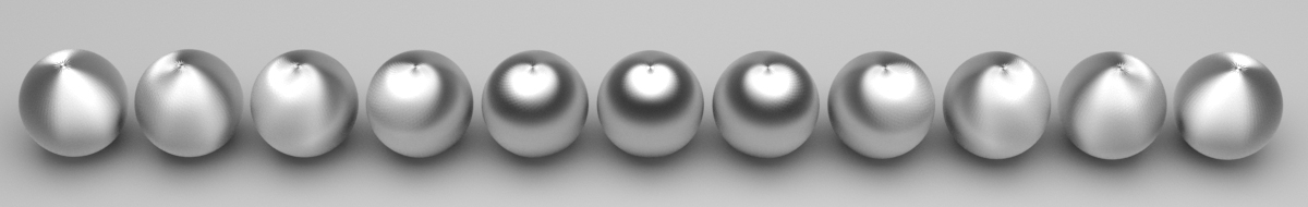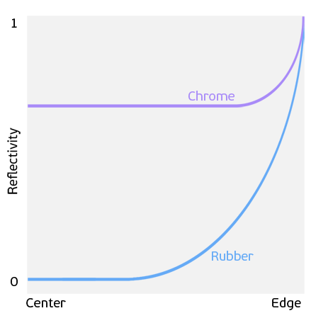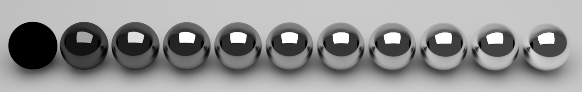 The Fresnel effect is more noticeable when using lower values. Increasing this value gives the material a more metallic-like specular reflection. Metals have a more uniform reflectance across all angles compared to plastics or dielectrics, which have very little normal reflectance. Note that the Fresnel effect is less evident when a surface become rougher (the unpredictable nature of a rough surface 'scatters' the Fresnel effect, preventing the viewer from being able to clearly see it). As visible in the images below, objects rendered with a correct Fresnel effect will appear to have brighter specular reflections near the edges.