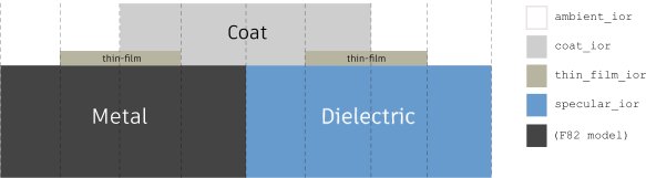 The assumed structure is as shown below, where the thin-film sits on top of the base (metal or dielectric), and beneath the coat. Thus it is tinted by the coat color if present. The IORs of the film itself as well as its adjacent media affect the look of the fringes.
