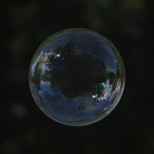 Though a soap bubble is technically a thin-walled structure, it can be modeled as non-thin-walled by making the interior dielectric have IOR 1, and applying the thin-film. The IOR for water is 1.33 and soap is about 1.5. Therefore the IOR (of the thin film) for a soap bubble should be in the 1.33-1.4 range. A grayscale map should be connected (through a Range shader) to Thin Film Thickness if variation in the Thin Film is required. More information about soap bubble color and film thickness can be found here.