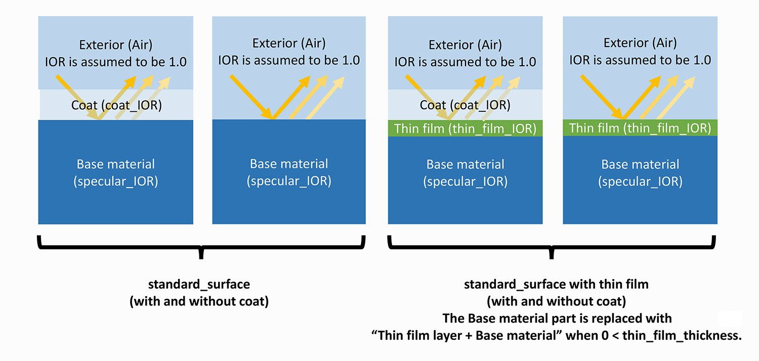- [Base Weight: 0](#base-weight-0) - [Specular Weight: 1](#specular-weight-1) - [Specular Color: 1 1 1](#specular-color-1-1-1) - [Specular Roughness: 0](#specular-roughness-0) - [Specular IOR: 1.0](#specular-ior-1-0) - [Transmission Weight: 1](#transmission-weight-1) - [Transmission Color: 1 1 1](#transmission-color-1-1-1) - [Coat: 1](#coat-1) - [Coat IOR: 1.5](#coat-ior-1-5) - [Thin Film: IOR 1.4](#thin-film-ior-1-4) - [Thin Film Thickness: 500 [nm]](#thin-film-thickness-500-nm)