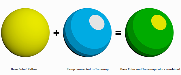 The Base Tonemap has a multiplier effect on the Base Color. The direct diffuse of the Base Tonemap is mapped onto the UVs and then the ramp is evaluated.