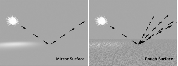 In the examples below, you can see that the specular reflection appears stretched when the surface becomes 'bumpy' or 'rougher'.