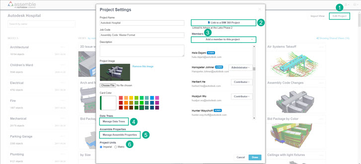 To change project settings, add new members to a project, manage data trees and manage Assemble projects, select Edit Project in the top, right corner of your project page.