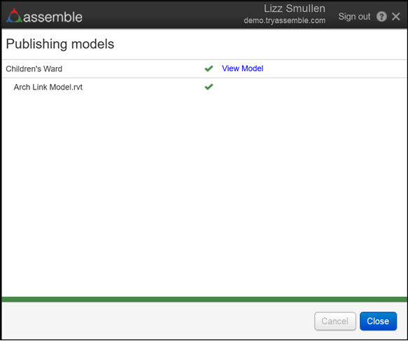 - If publishing to individual models in Assemble, you can view a model after it has been published by selecting View Model.