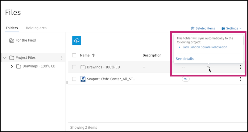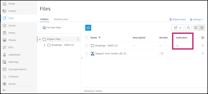 In the Files tool, when folders are automatically synced to or from another project, the Indicators attribute provides details about the syncing that is occurring. Learn more about Indicators in Project-Level File Attributes.