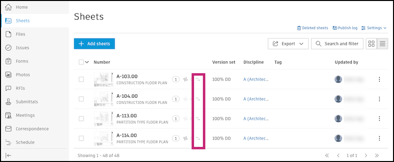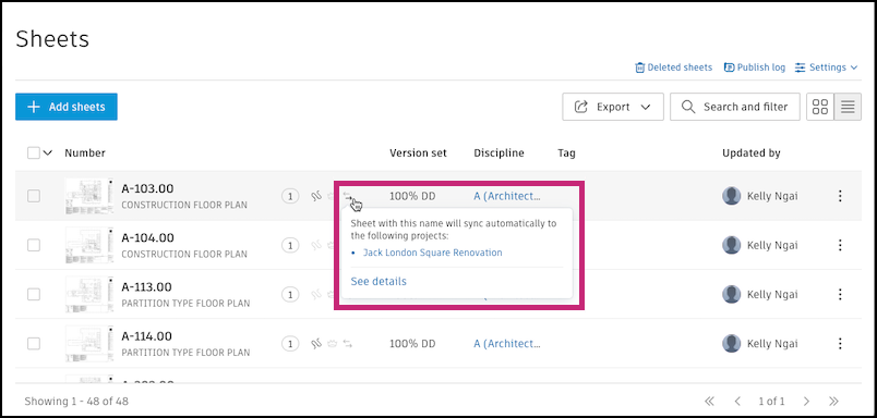 When you automatically sync sheets to or from another project in the Sheets tool, the Indicators attribute provides details about the syncing that is occurring. Learn more about Indicators in Working With The Sheets List.