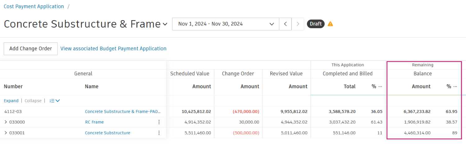 Claimed Work Completed: Add this column group when you want to create a cost or budget payment application document. Include the claimed amount and rejected reasons to satisfy the legal requirement.