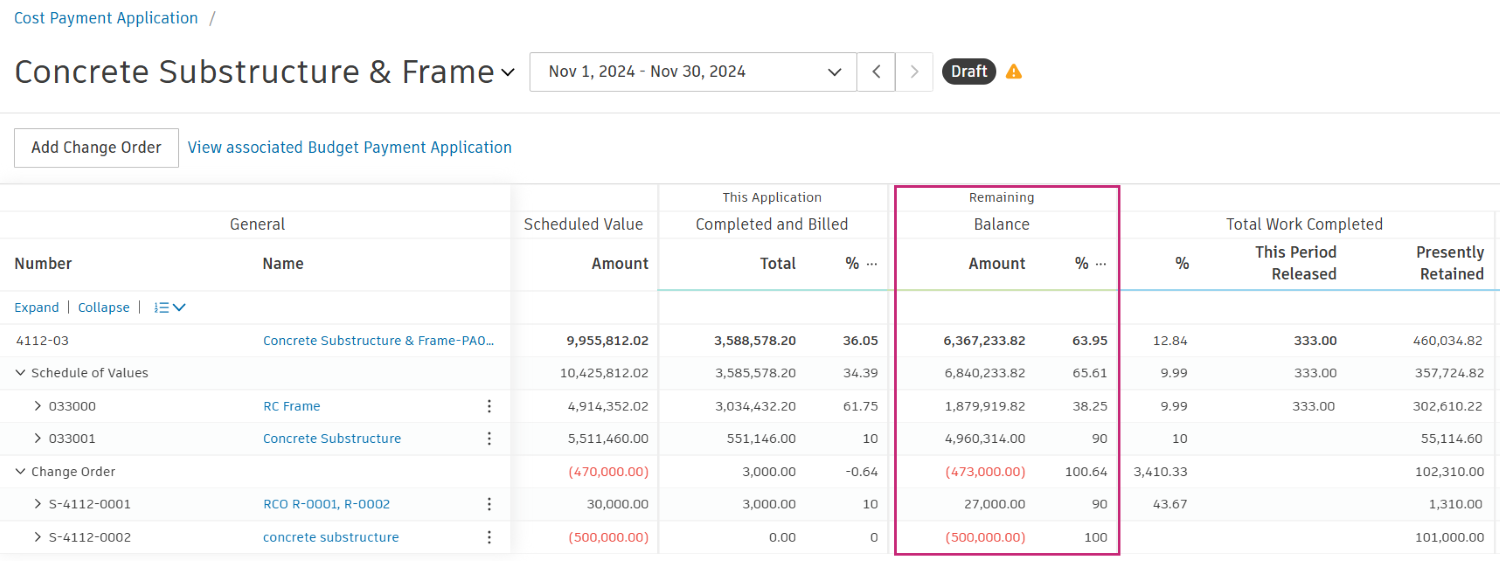 - Scheduled Value: Provides the details about the cost item from the projected budget.