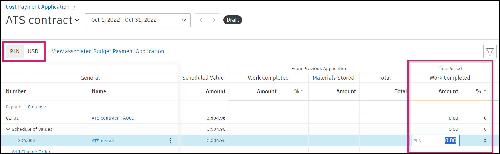 Switch to the Budget Payment Application or Cost Payment Application tab. For a cost payment application, open the detail view by clicking the icon next to it.