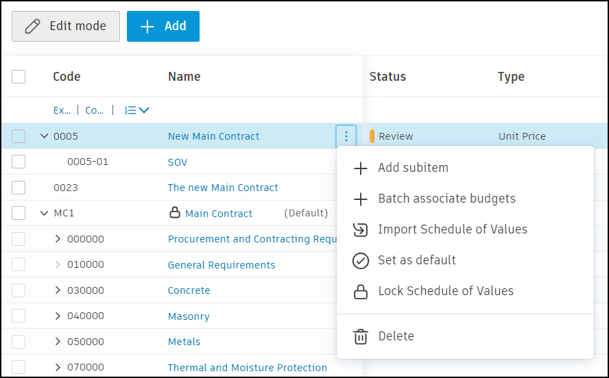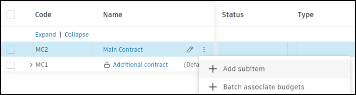 You can add subitems that were not part of an initial budget by using the More menu . See the Add or Delete Subitems in the Main Contract section to learn more. More than one contract can be created. If you've added more than one contract, select the More menu next to the item's name to set which is the default one.