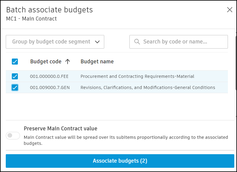 7. Selecting from the Batch Associate Budget window means that the original unit cost of the main contract item will be overridden and will show the new selected budget item value. If you do not want this, toggle the Preserve Main Contract value option to spread over its subitems proportionally, according to the associated budgets. See the Spread Markup Budget Value in Main Contract SOV section to learn more.