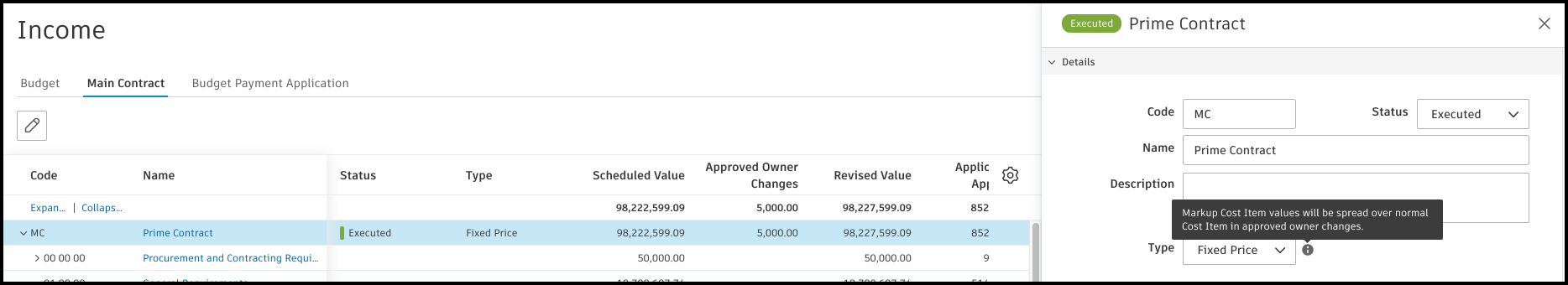 • Fixed Price - Work carried out for a fixed sum where actual costs incurred may differ from the incoming value paid. If you choose this option, markup cost item values will be spread over normal cost items in approved owner changes. Learn more about spreading markup budget values.
