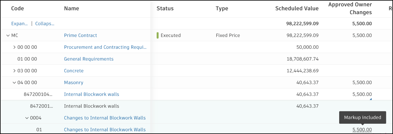 • Markup cost items and the Markup Summary section are hidden in the budget payment application, and an owner sees the full price with all markups without marking them.