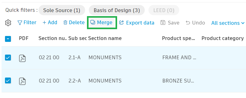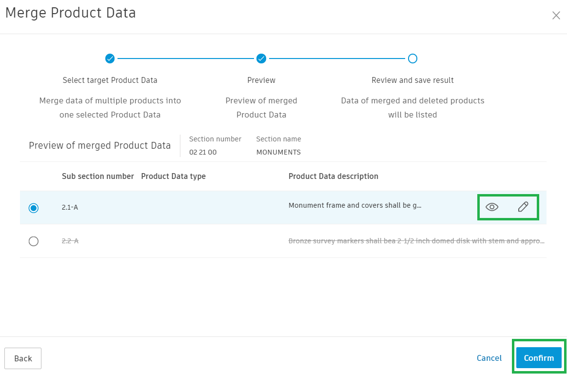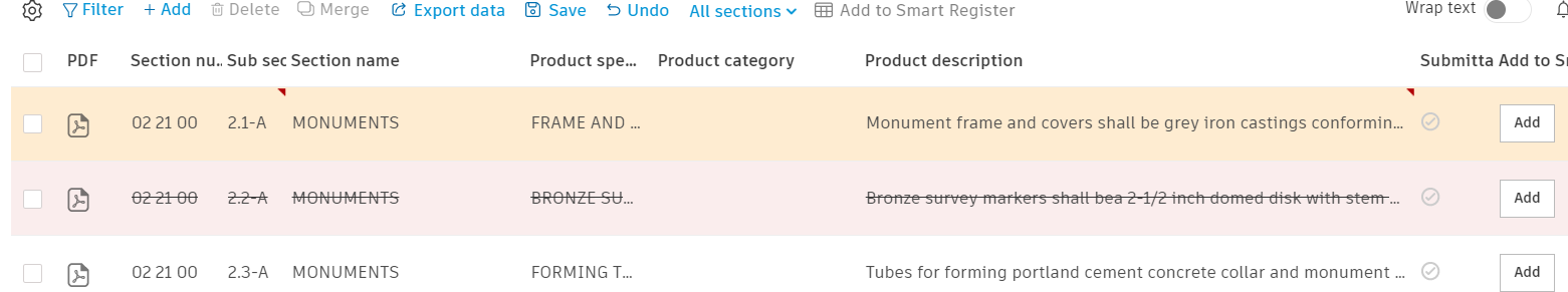 Once you've completed merging the product data items, your log will be updated. The product data items that were merged will appear as deleted, with details crossed out and their rows appearing in red. The target product data item will be highlighted in yellow.