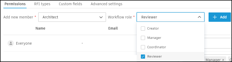 Note: Reviewer permissions don't take effect until the RFI is in the Open status.