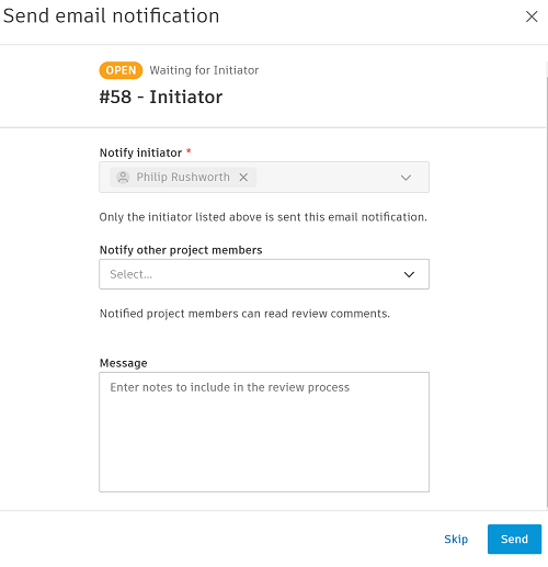 You can choose to send an email notification to the initiator and also notify any other project members if desired.
