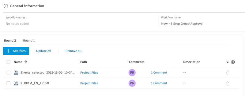 Each review round has a tab displaying the files in that round. The files listed in the new round tab are copied from the previous round and are ready for modifying by the initiator.