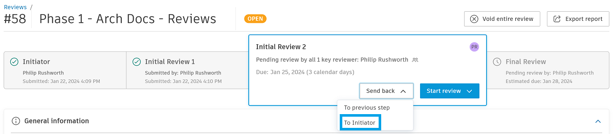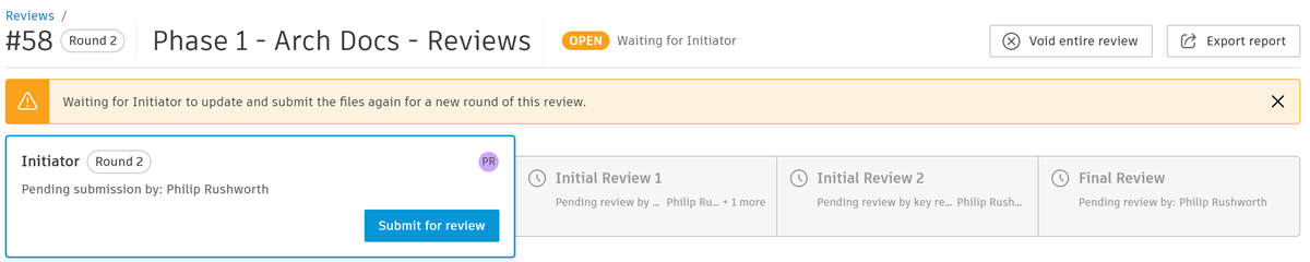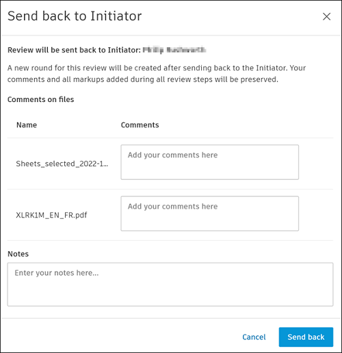 You may want to send a review back to the initiator if, for example, the files to review are the wrong ones or are out of date. Instead of voiding the whole review, you can send the review back to the initiator so they can update the files. When the initiator resubmits the review, this will automatically create a new review round for the updated files and reinitiate the review workflow.