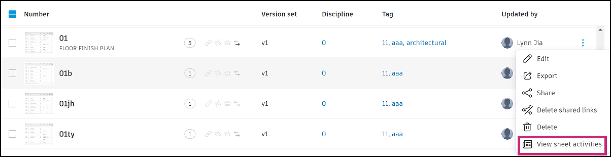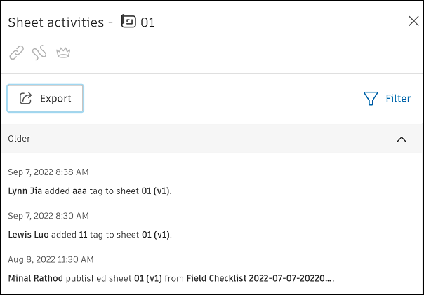 You can export a log of these sheet activities by clicking Export. The log will download as a CSV file to your local downloads folder or you can select for the activity log to be sent to you by email.