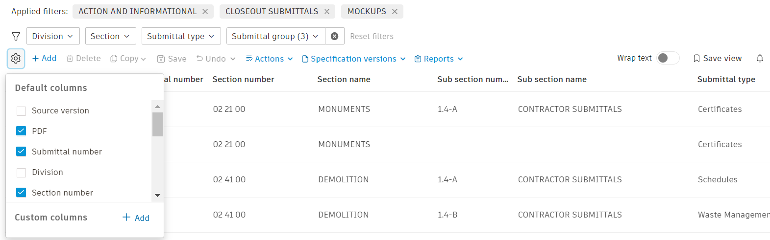From this view, you can configure columns, add or remove columns, and filter and sort specifications.