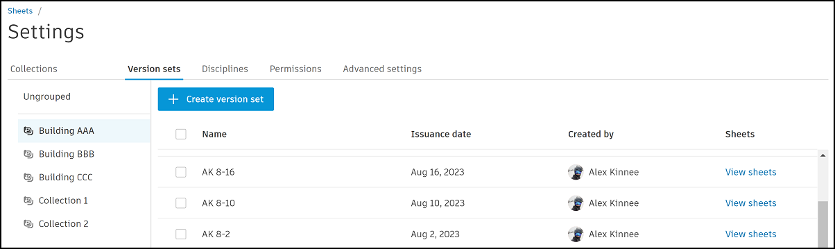 In the tab, you can see all the version sets created in the project. If you have collections enabled, click a collections to see all version sets associated to that collection. Version sets are sorted by issuance date, newest to oldest.