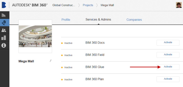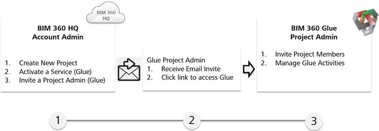 - Then activate a project and service such as BIM 360 Glue. You can also add one or more project admins. The project admin will receive an invitation email and a link that allows them to sign in to the project where they can invite project team members.