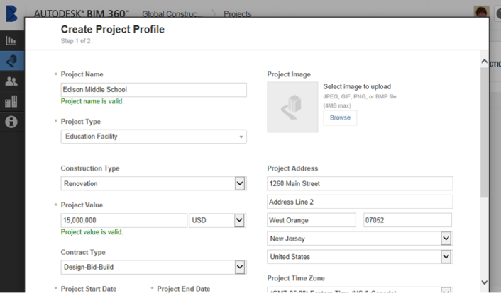 Account admins create a single project profile that is shared across BIM 360 services. Project information such as the project name, project type, ID, start and end dates, physical address, and project image is managed centrally at the enterprise or account level. Product specific information relevant to a project is managed by the Project Admin in the specific product.