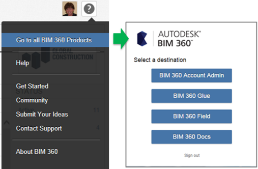 - Go from Account Admin to Glue. From the account administration help drop down menu, select Go to All BIM 360 Products to access the unified BIM 360 sign in page.
