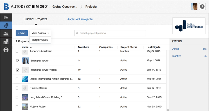 If you have been using other BIM 360 products, such as BIM 360 Field, you may have duplicate Glue and Field projects. We recommend that you merge your Glue projects with existing BIM 360 projects as soon as possible to get the full benefit of the unified BIM 360 account administration and to avoid problems.